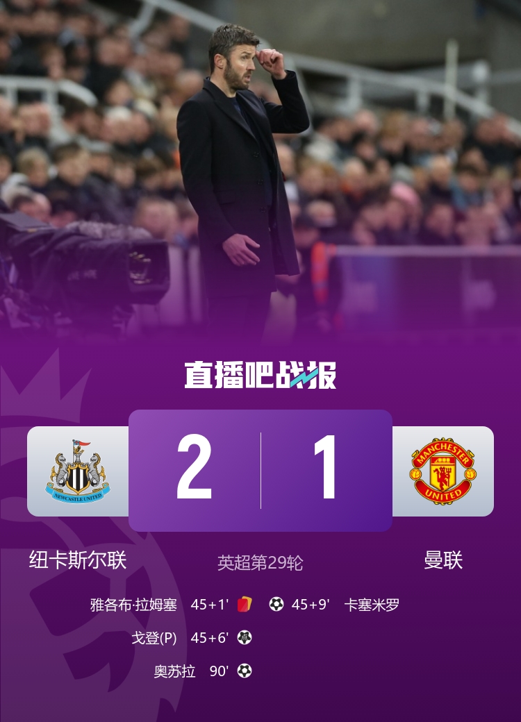 英超联赛第29轮,十人作战的纽卡斯尔联2-1绝杀曼联,奥苏拉绝杀,卡塞米罗进球难救主。