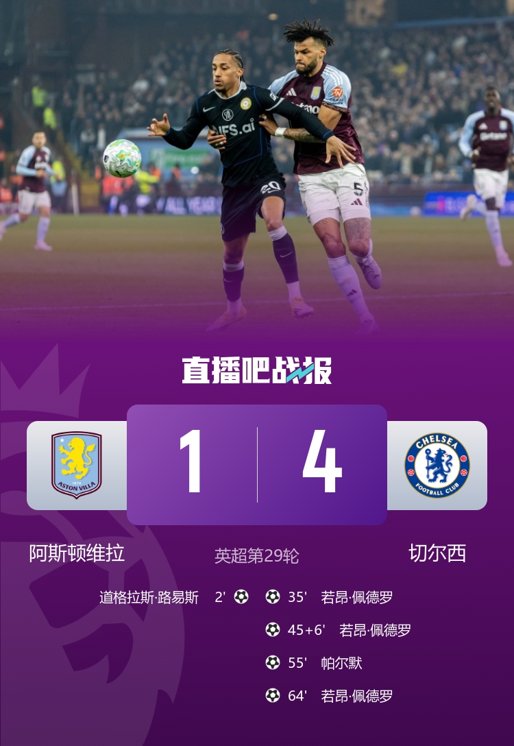 英超第29轮,切尔西客场4-1逆转阿斯顿维拉,佩德罗帽子戏法。