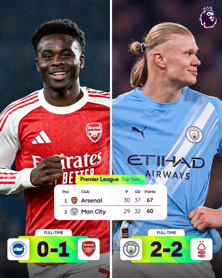 英超第29轮,志在争冠的曼城在保级队身上栽跟头,本轮被诺丁汉森林逼平送出关键积分。另一边,阿森纳虽踢得惊险,但还是成功战胜布莱顿,成功收下三分。