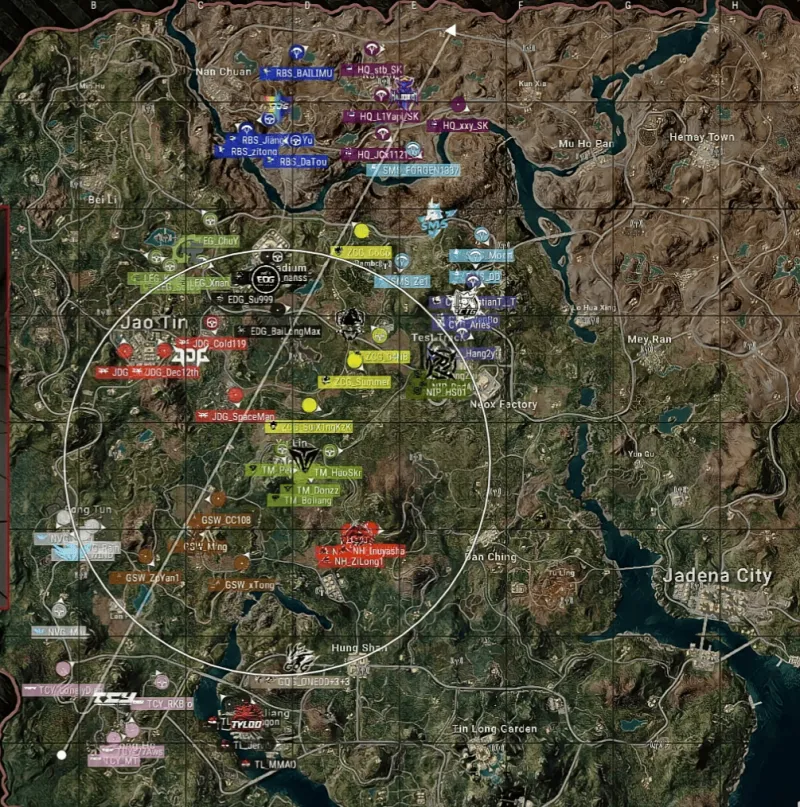 阶段7刷新后,圈向城外的ZCG靠近,城内的TM、CTG、SMS交火,NVG独狼被ZCG打掉。SMS和TM先后被淘汰,CTG被TM打掉一人。