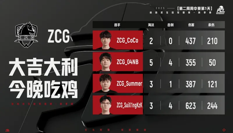 阶段8,ZCG全线压进,随后打掉CTG一人,但自己也被反打一人,随后ZCG一人回收留两人前顶,二人依靠手雷及补枪团灭CTG残编,完成吃鸡。