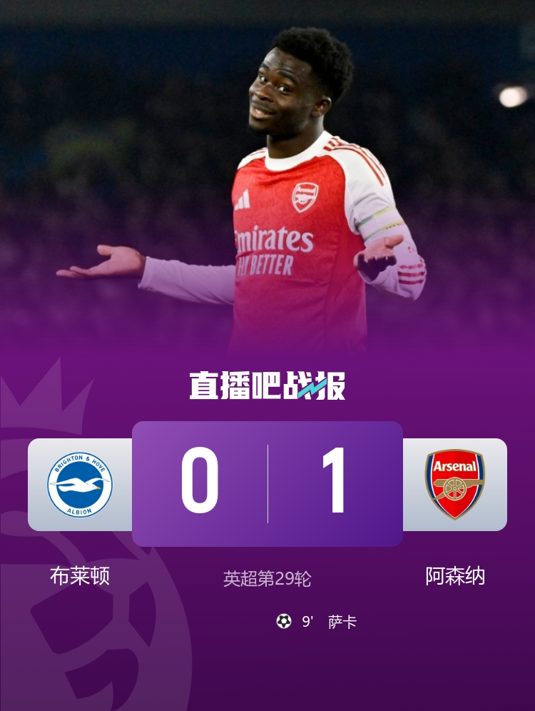 英超第29轮,阿森纳客场1-0力克布莱顿,萨卡制胜。