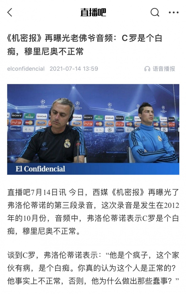 2021年期间,《机密报》连续披露多段弗洛伦蒂诺的私下谈话内容,引发轩然大波。录音中包含对多位足坛名人的尖锐评价,如称"C罗精神不正常"、"穆里尼奥行为反常"、"卡西利亚斯像条谄媚的狗"以及指控劳尔与卡西存在欺骗行为等。